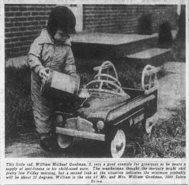 Snow To Miss Midstate Planes Idled - William Michael Goodman, 2, sets a good example for grownup as he pours a supply of anti-freeze in his child-sized auto. William is the son of Mr. and Mrs. William Goodman, 3609 Sabre Drive. - Nashville Banner: Thursday, January 19, 1956, Front Page (1)