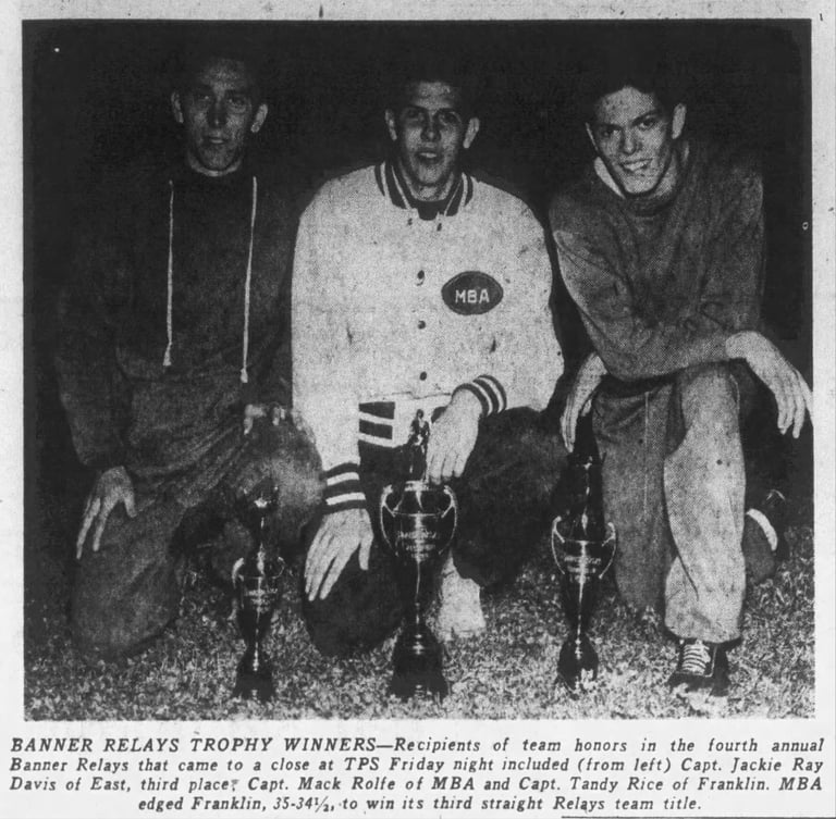 MBA Wins Third Straight Banner Relays - Edges Franklin By Half Point; Eight New Records Set: Banner Relays Trophy Winners - Nashville Banner: Saturday, April 21, 1956, Page 9