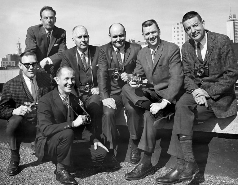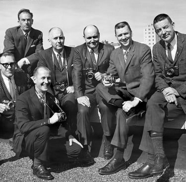 Nashville Banner: Circa 1965 - Banner photographers pose with their new 35mm cameras on the roof of the Banner building at 1100 Broadway. Back row left to right: Marshall Rawls (dark room), Vic Cooley, Bill Goodman, Jack Gunter and Bob Ray. Front row seated left to right: Charles Warren and Don Foster.