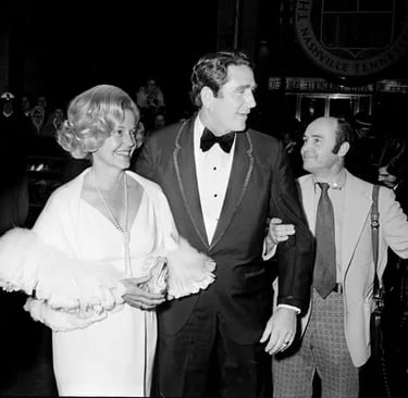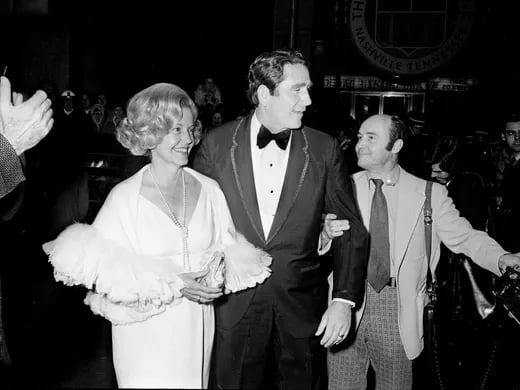 Former Gov. Winfield Dunn, center, and wife Betty arrive for the world premiere of 'W.W. and the Dixie Dancekings" at downtown Loews Crescent theater. Giving a helping hand is Nashville Banner staff photographer Bill Goodman, right. - The Tennessean, Jimmy Ellis: February 4, 1975
