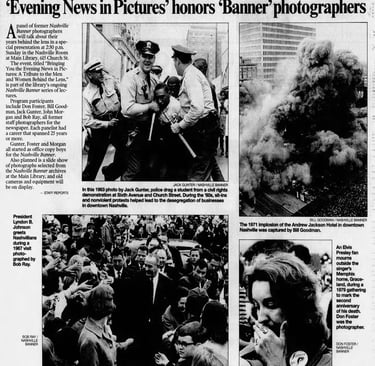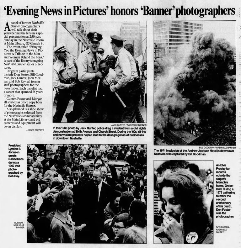 'Evening News in Pictures' honors 'Banner' photographers - A panel of former Nashville Banner photographers will talk about their years behind the lens in a special presentation. Participants include Don Foster, Bill Goodman, Jack Gunter, John Morgan and Bob Ray. - The Tennessean: Thursday, April 10, 2003, Page 2M