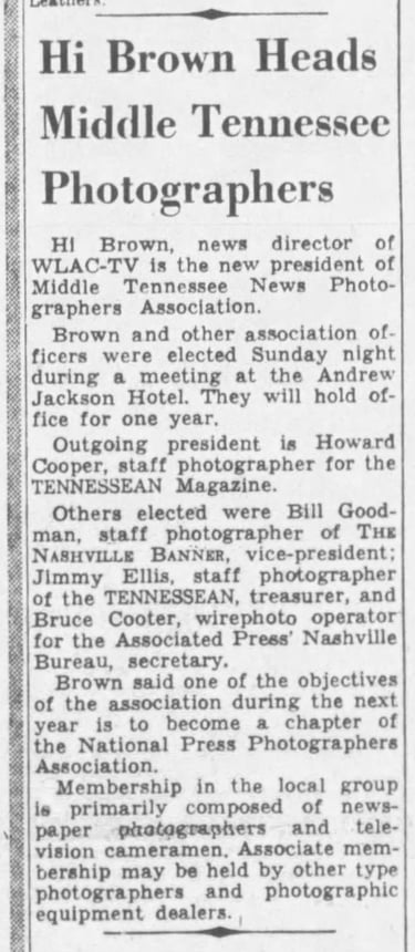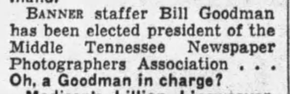 Hi Brown Heads Middle Tennessee Photographers: Others elected were Bill Goodman, staff photographer of The Nashville Banner, vice-president - Nashville Banner: Monday, August 31, 1959, Page 5