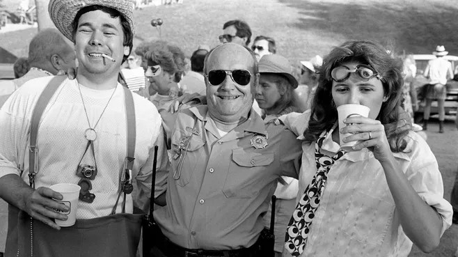 Nashville Banner photographers Larry McCormack, left, Bill Goodman, and McCormack's wife, Lisa, are enjoying the activities at the fourth annual Swine Ball. - The Tennessean, Dan Loftin, June 2, 1984