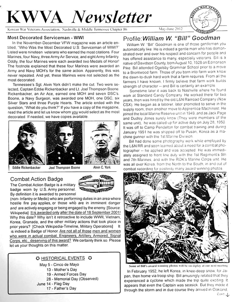 KWVA Newsletter: Korean War Veterans Association, Nashville & Middle Tennessee Chapter 86, May-June 2012, Front Page 1 - Profile: William W. "Bill" Goodman